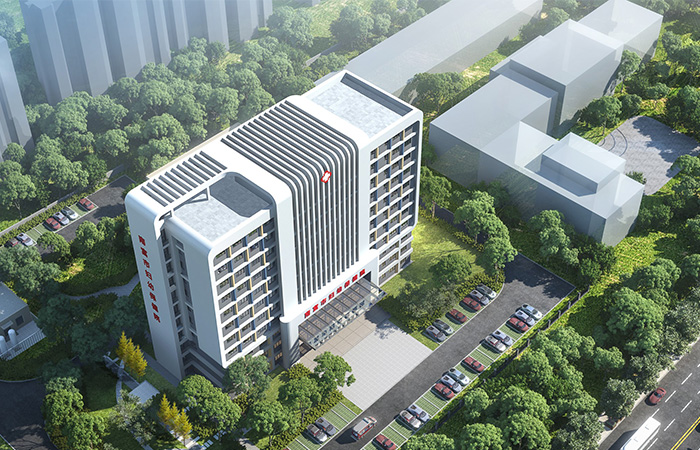 规划设计在现状建筑西侧植入新建建筑体量,新建建筑与原有建筑形成中轴对称的总体布局。在病房楼四周,设置大面积绿地景观,营造出绿色共享的景观区域,与自然为邻,享受舒适环境。
